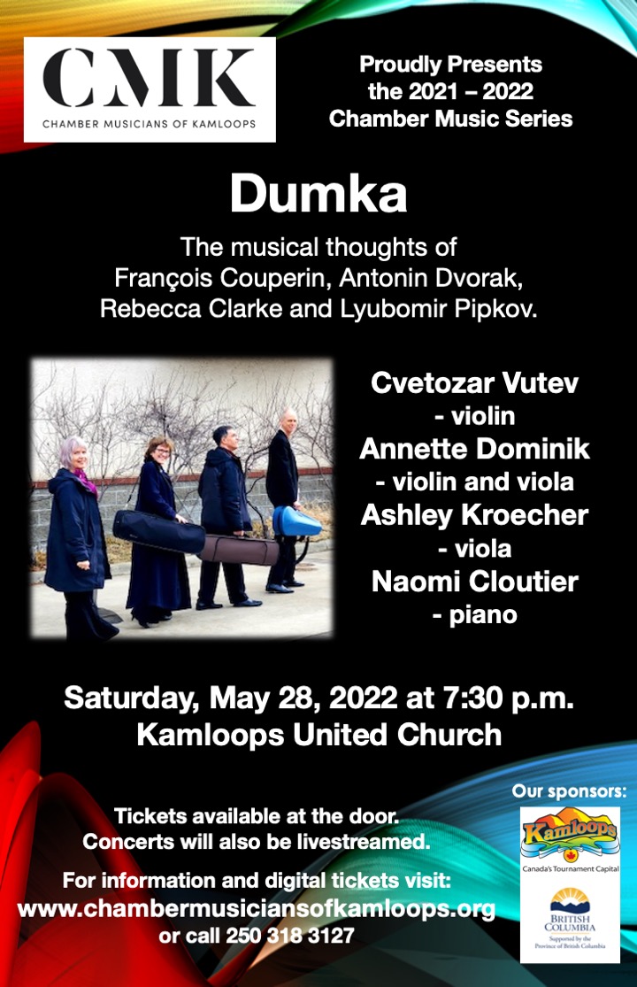 “Dumka” features musical thoughts of the 18th-century French Baroque composer F. Couperin, the 19th-century Czech composer A. Dvorak, and the two 20th-century composers – R. Clarke, from England, and L. Pipkov, from Bulgaria – brought to life by virtuoso pianist Naomi Cloutier and the Sycamore Quartet.