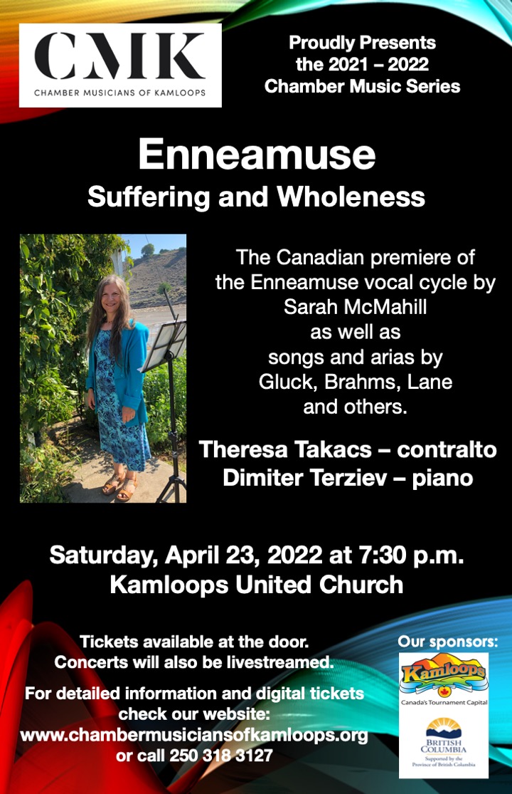 A recital based on the music and ideas of Sarah McMahill, a personal growth coach, multimedia artist, and composer associated with Enneagram teaching. This will be the Canadian premiere of the vocal cycle Ennaemuse. The music is composed to convey what each personality type (enneagram) looks like from the inside. Also included are songs and arias by Brahms, Gluck and Burton Lane.